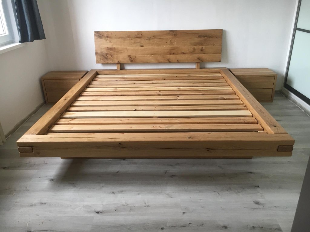 Masivní dubová postel s nočními stolky v rustikálním stylu.